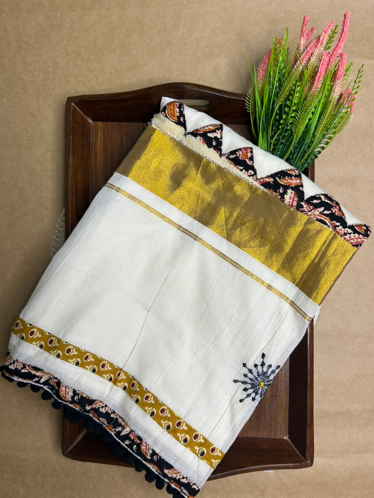 Embrace the serene elegance of South India with our Kerala Cotton Saree, known for its pristine white base and graceful golden zari border. Woven from premium handloom cotton, this saree exudes purity, comfort, and timeless charm — perfect for festive occasions, temple visits, and cultural celebrations.